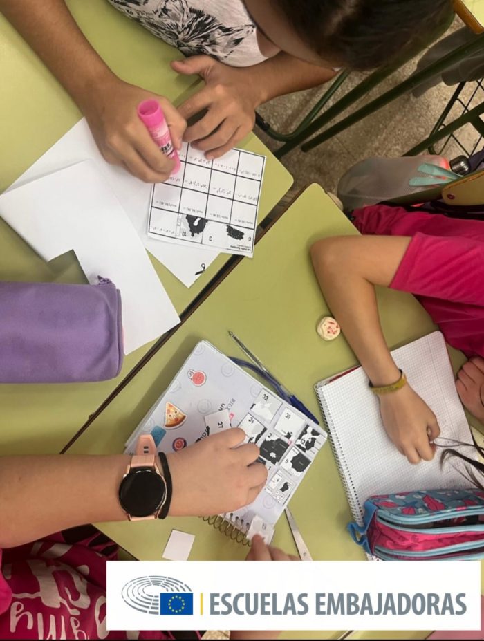 Almnado de 1º ESO inmerso en el proyecto interdisciplinar de las Escuelas Embajadoras del Parlamento Europeo, donde construyen un puzzle con el mapa de Europa mediante cálculos matemáticos.