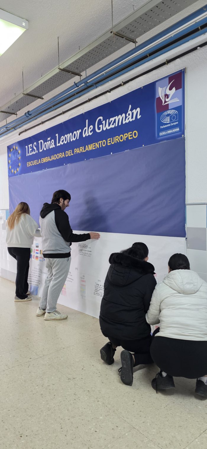 Durante la semana pasada,  embajadores junior montando el Info Point, el punto informativo que muestra tanto información del Parlamento europeo como los trabajos que han ido realizando el alumnado sobre Europa y la Unión europea.